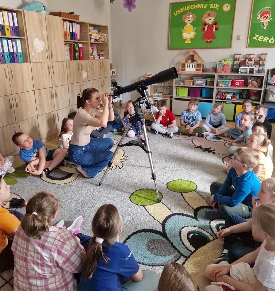 Podczas zajęć dzieci utrwaliły nazwy planet krążących wokół Słońca, poznały działanie i wygląd teleskopu, jako jednego z podstawowych narzędzi astronomów oraz uczestniczyły w zabawach edukacyjnych związanych z tematyką kosmiczną.