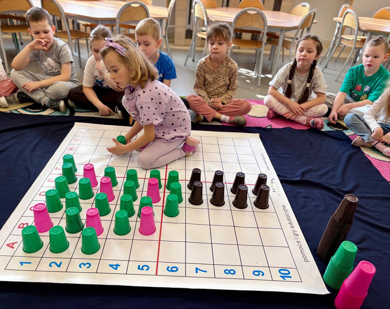 W grupach zerowych obchodziliśmy Dzień Matematyki, który był pełen ciekawych zabaw i matematycznych wyzwań. Dzieci miały okazję rozwijać swoje umiejętności poprzez różnorodne aktywności, takie jak kodowanie, przeliczanie elementów, tworzenie zbiorów oraz poznawanie i stosowanie znaków równości, większy i mniejszy.