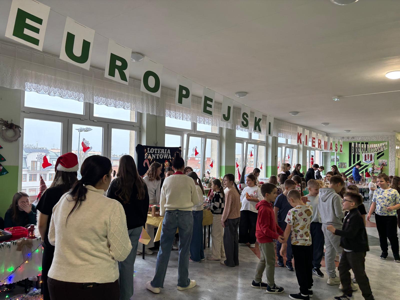 Dnia 8 grudnia w naszej szkole odbył się Europejski Jarmark Świąteczny. Podczas wydarzenia uczniowie, nauczyciele oraz rodzice przygotowali stoiska z przepysznymi ciastami, ciasteczkami oraz ręcznie wykonanymi ozdobami bożonarodzeniowymi. Całkowity dochód ze sprzedaży został przeznaczony na wsparcie Domu Dziecka, dzięki czemu szkolna społeczność mogła połączyć świąteczną atmosferę z pomocą potrzebującym. Jarmark cieszył się dużym zainteresowaniem i przebiegał w radosnym, przedświątecznym nastroju.