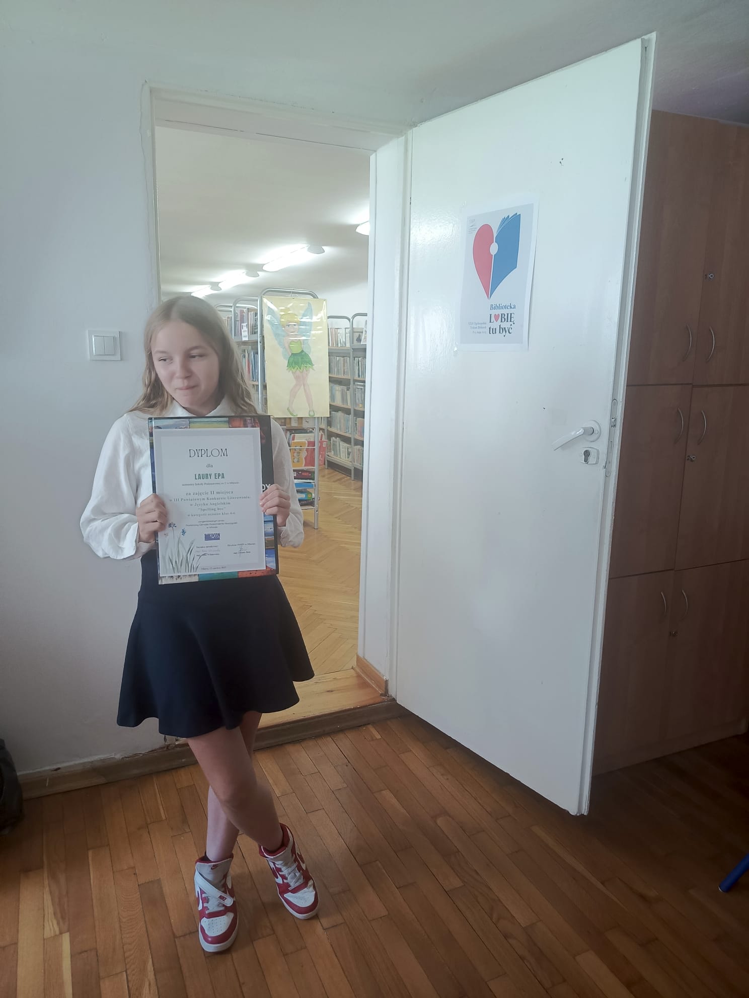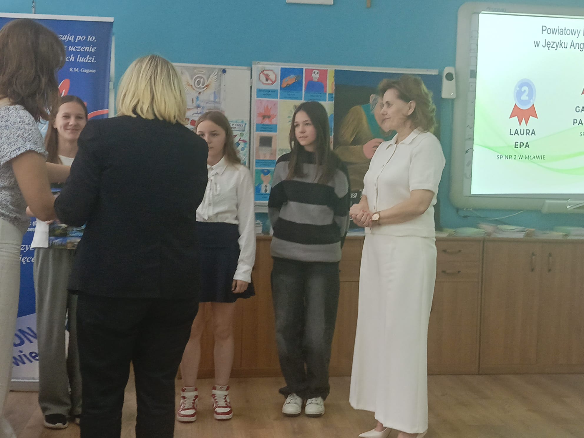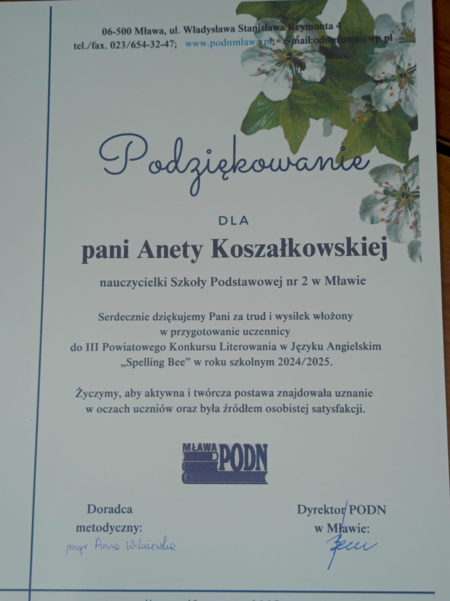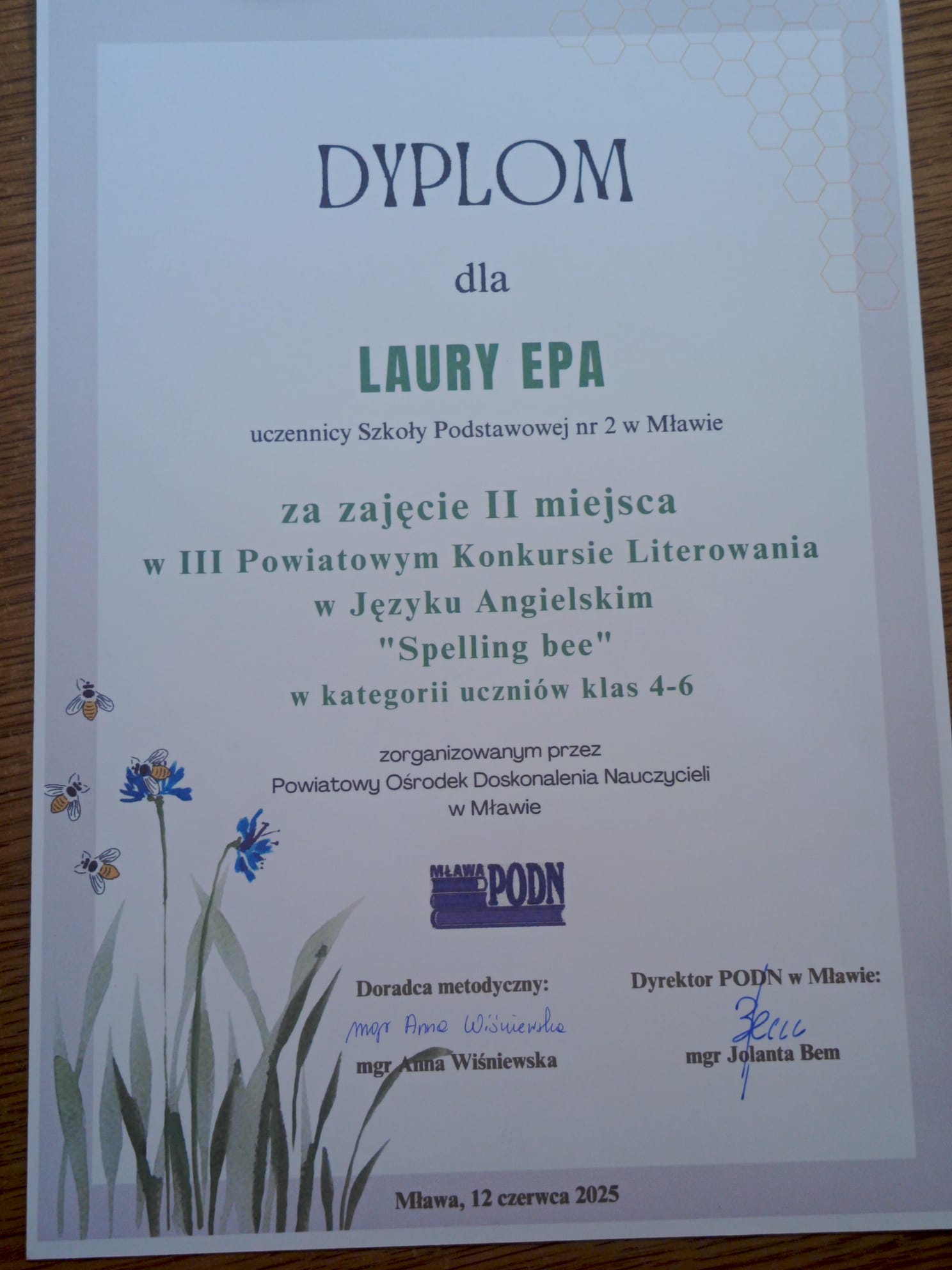12 czerwca 2025 r. uczennica klasy 6a Laura Epa odebrała nagrodę za zajęcie II miejsca w III Powiatowym Konkursie Literowania w Języku Angielskim Spelling bee w kategorii uczniowie klas 4-6 zorganizowanym przez Powiatowy Ośrodek Doskonalenia Nauczycieli w Mławie.