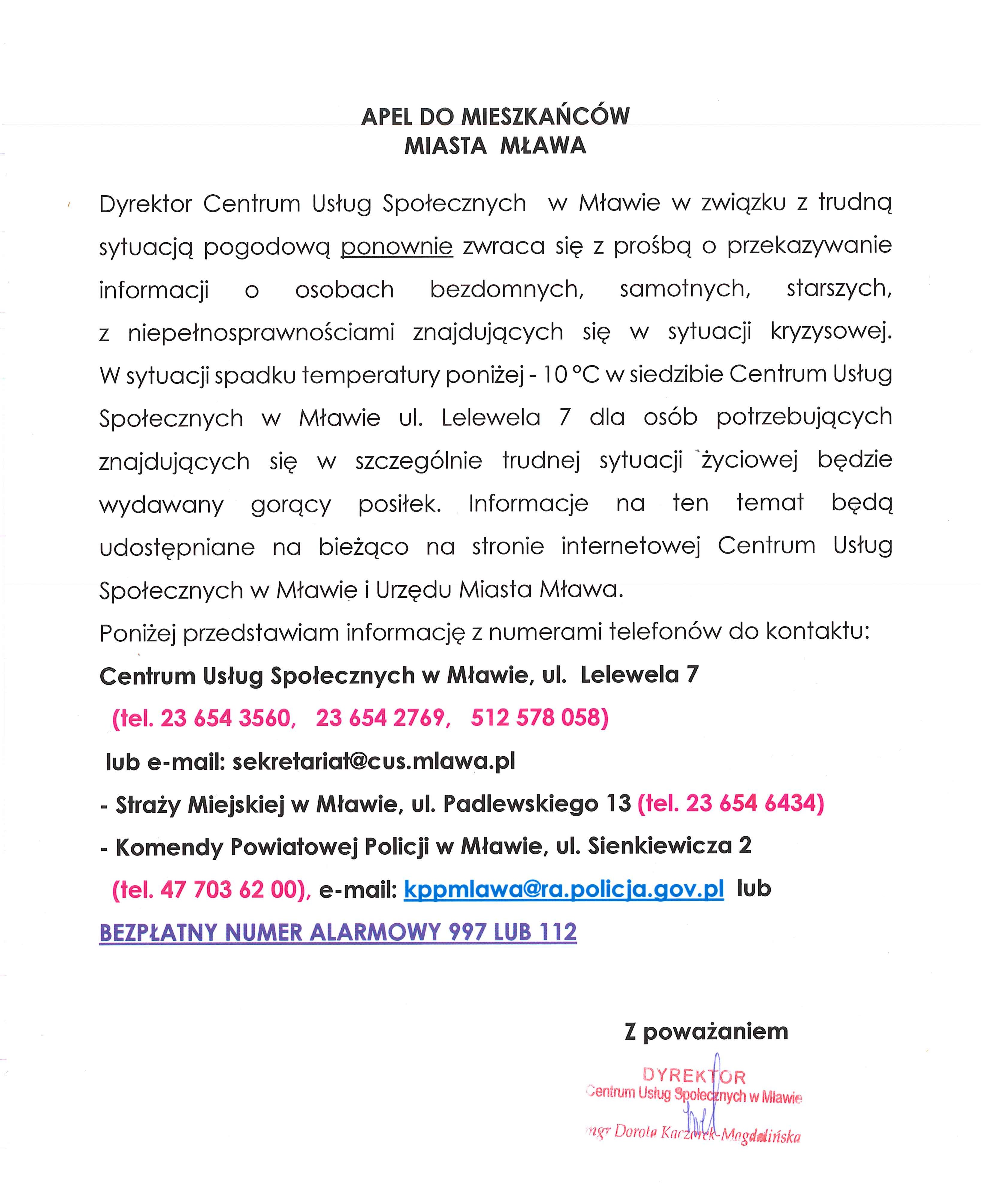 W związku z utrzymującymi się niskimi temperaturami Centrum Usług Społecznych informuje, że od 7.01.2026 r. przez najbliższe dni w siedzibie Centrum przy ul. Joachima Lelewela 7 w Mławie od godz. 13:00 do godz.14:00 będzie wydawany gorący posiłek dla osób potrzebujących znajdujących się w szczególnie trudnej sytuacji życiowej.