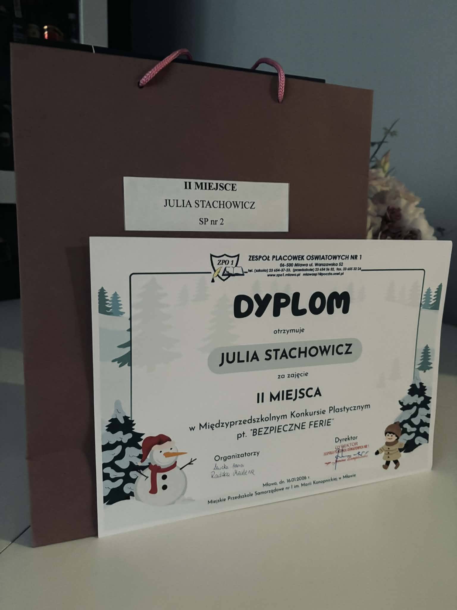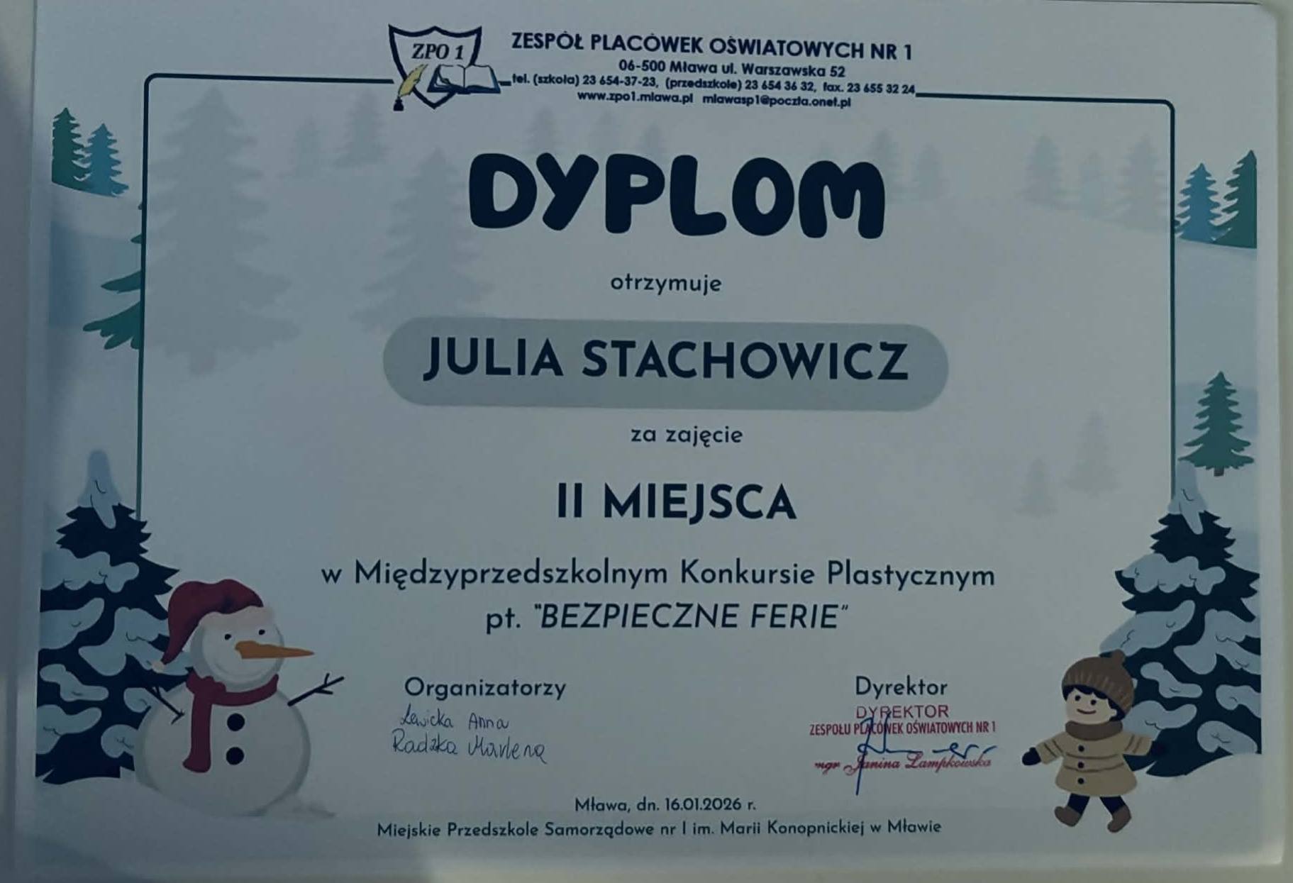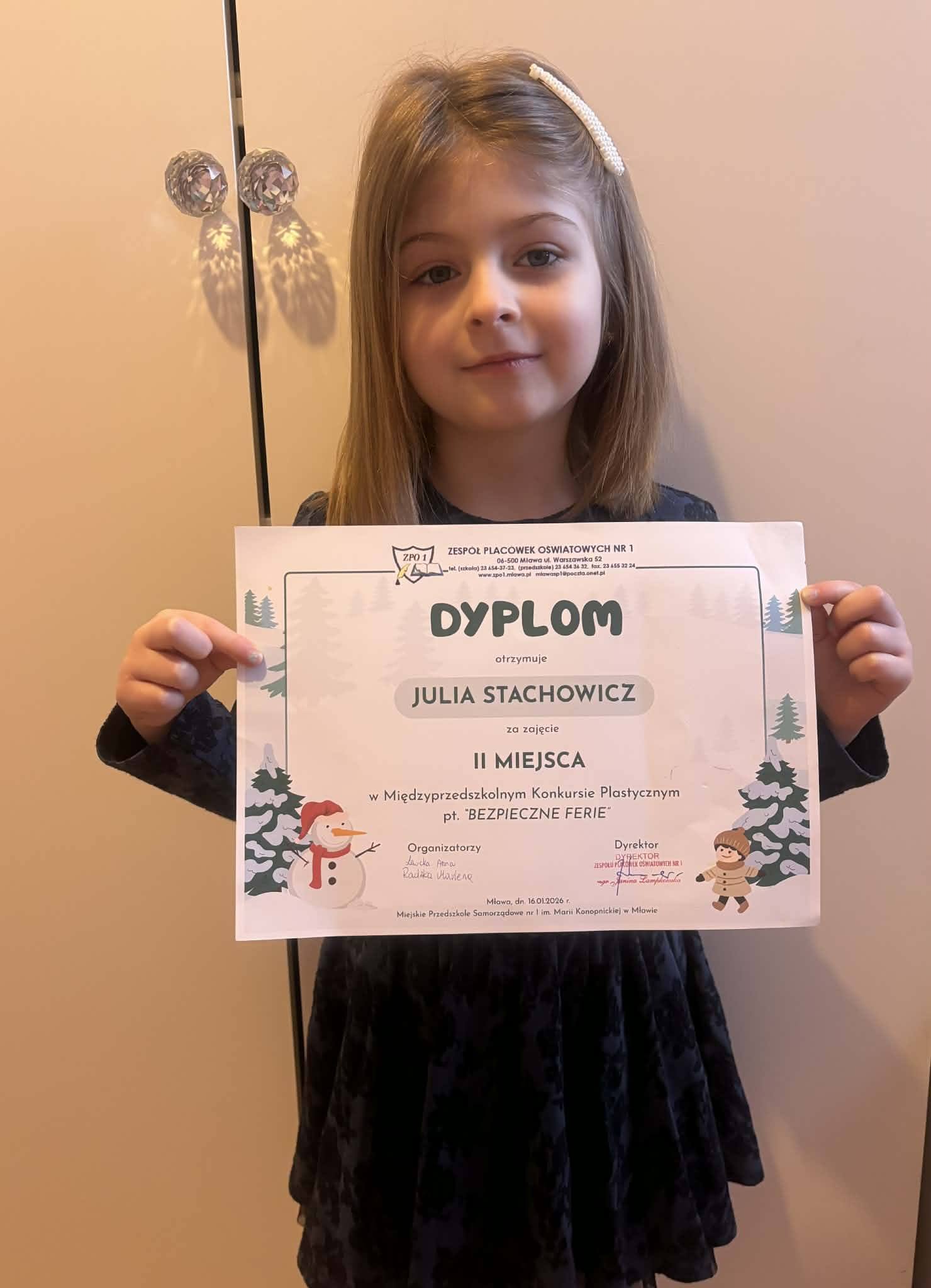 Julia Stachowicz z grupy 0c zajęła II miejsce w międzyprzedszkolnym konkursie plastycznym pt. „Bezpieczne ferie”.