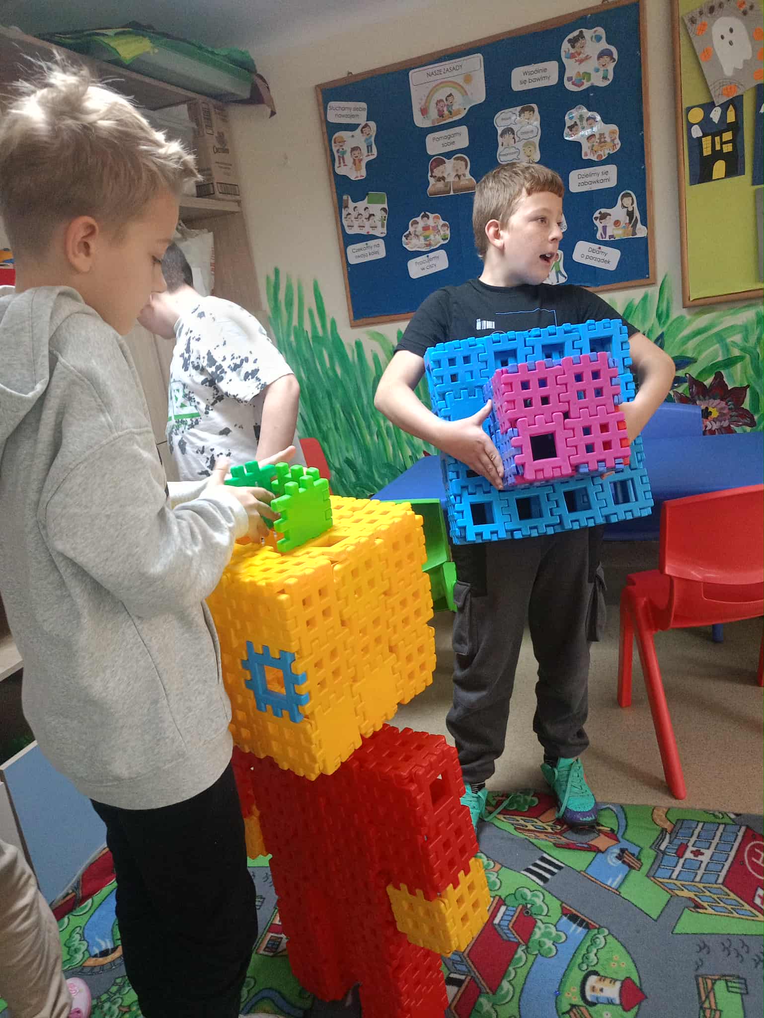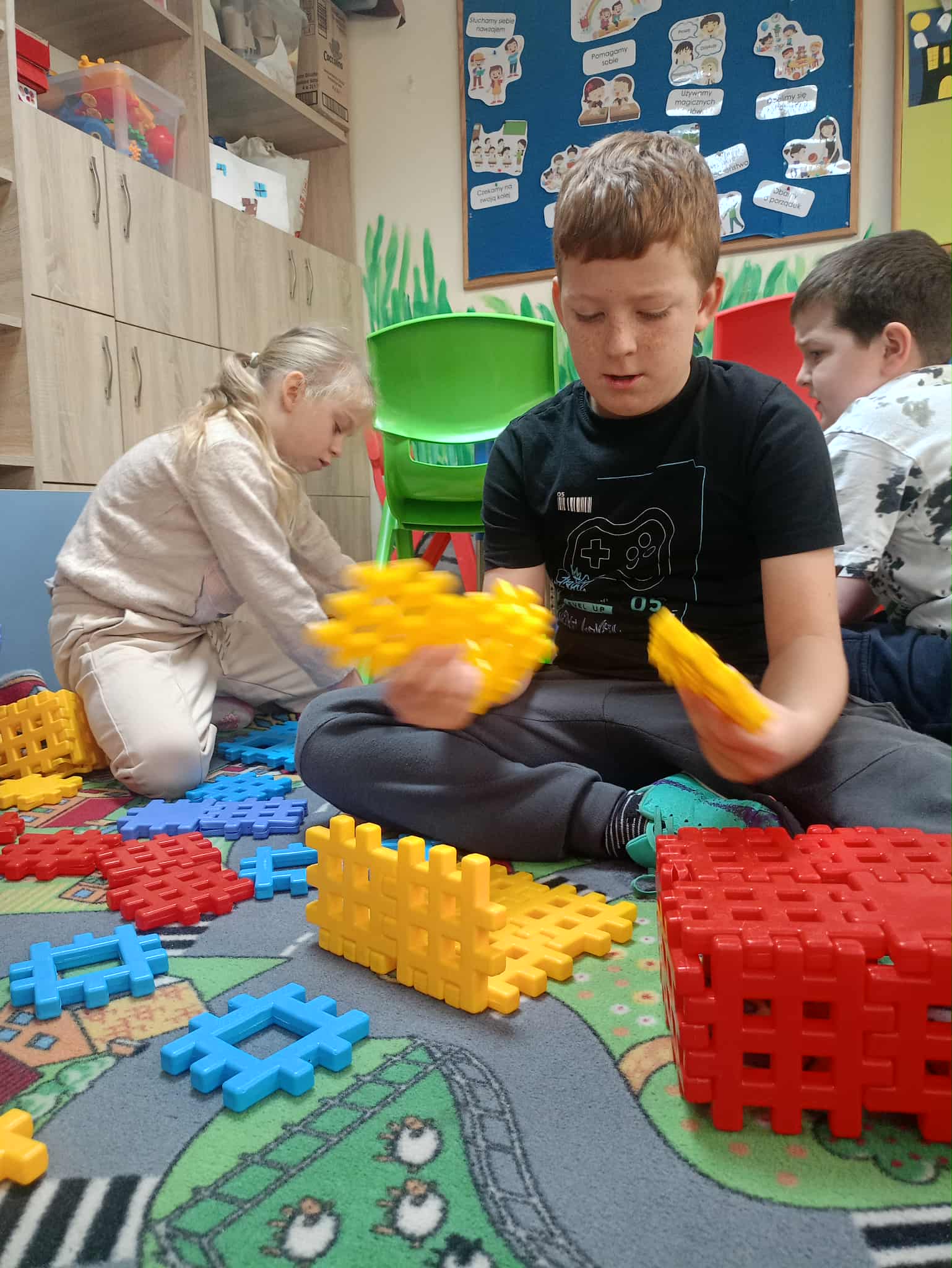 Na świetlicy szkolnej odbyły się zajęcia rozwijające umiejętności konstrukcyjne z wykorzystaniem klocków. Uczniowie z zaangażowaniem tworzyli własne budowle, wykazując się kreatywnością, pomysłowością oraz umiejętnością współpracy w grupie. Zajęcia sprzyjały również rozwijaniu myślenia przestrzennego i logicznego. Uczniowie tworzyli różnego rodzaju budowle oraz postacie z ulubionych gier i bajek.