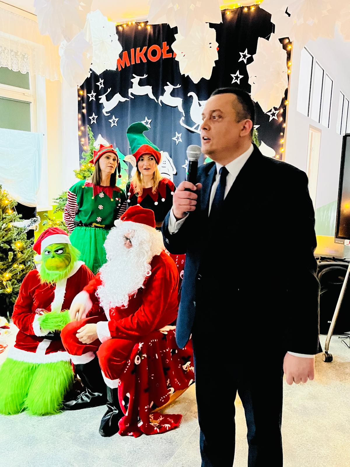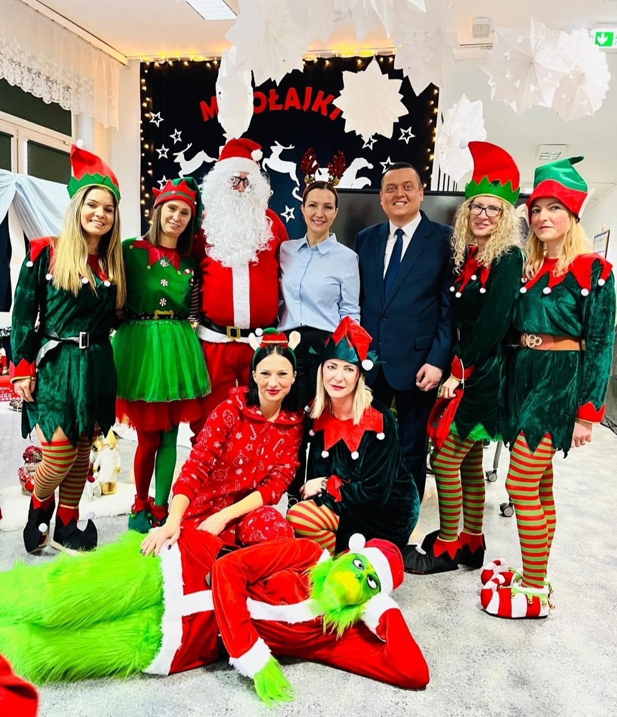 Potem ruszyły szalone zabawy mikołajkowe! Były tańce, w których wszyscy podskakiwali tak wysoko, jakby chcieli sprawdzić, czy na suficie nie ukrył się jakiś prezent. Sala brzmiała od śmiechu, a energia była tak duża, że choinka chyba szybciej zaczęła migotać. Elfy pojawiły się w swoich zielonych czapkach (niektóre miały je lekko przekrzywione, bo podobno spieszyły się do pracy w fabryce prezentów). Był też taniec elfów – tak wesoły, że nawet najpoważniejsze misie z półki zaczęły się kołysać.