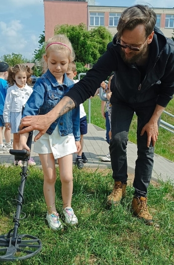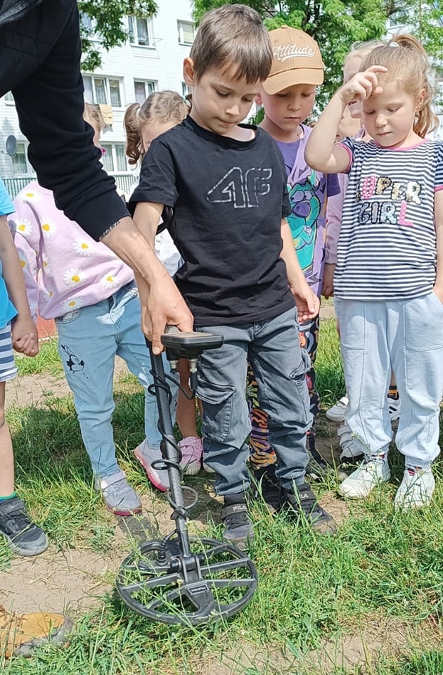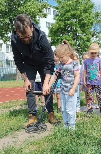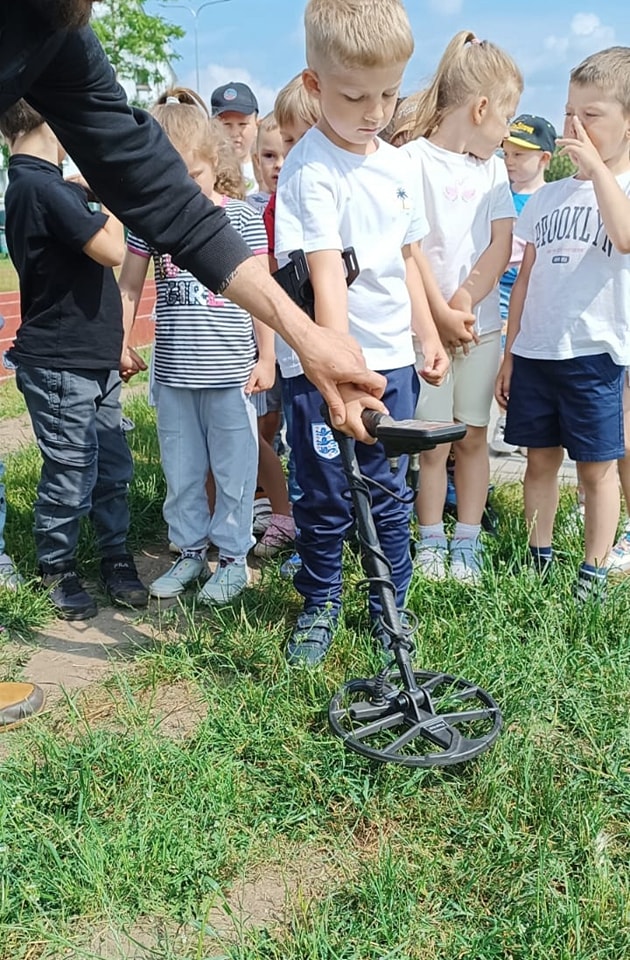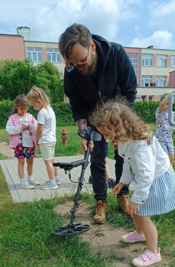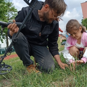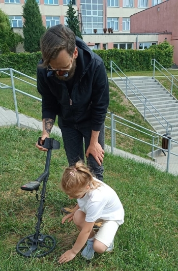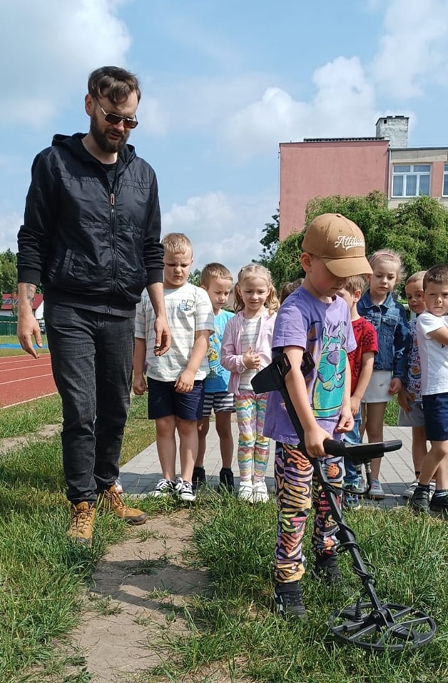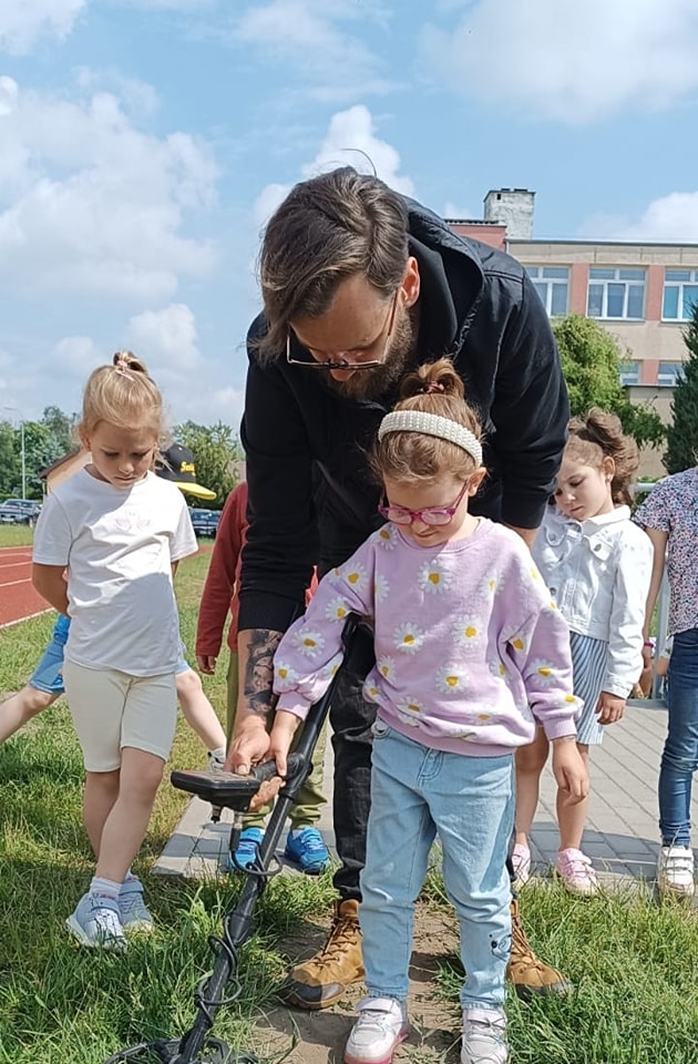 Dziś szkolne podwórko zamieniło się w prawdziwe pole poszukiwaczy skarbów!. Odwiedził nas tata Igora, który przyniósł ze sobą wykrywacz metalu i zaprosił dzieci do wspólnej zabawy w odkrywców.