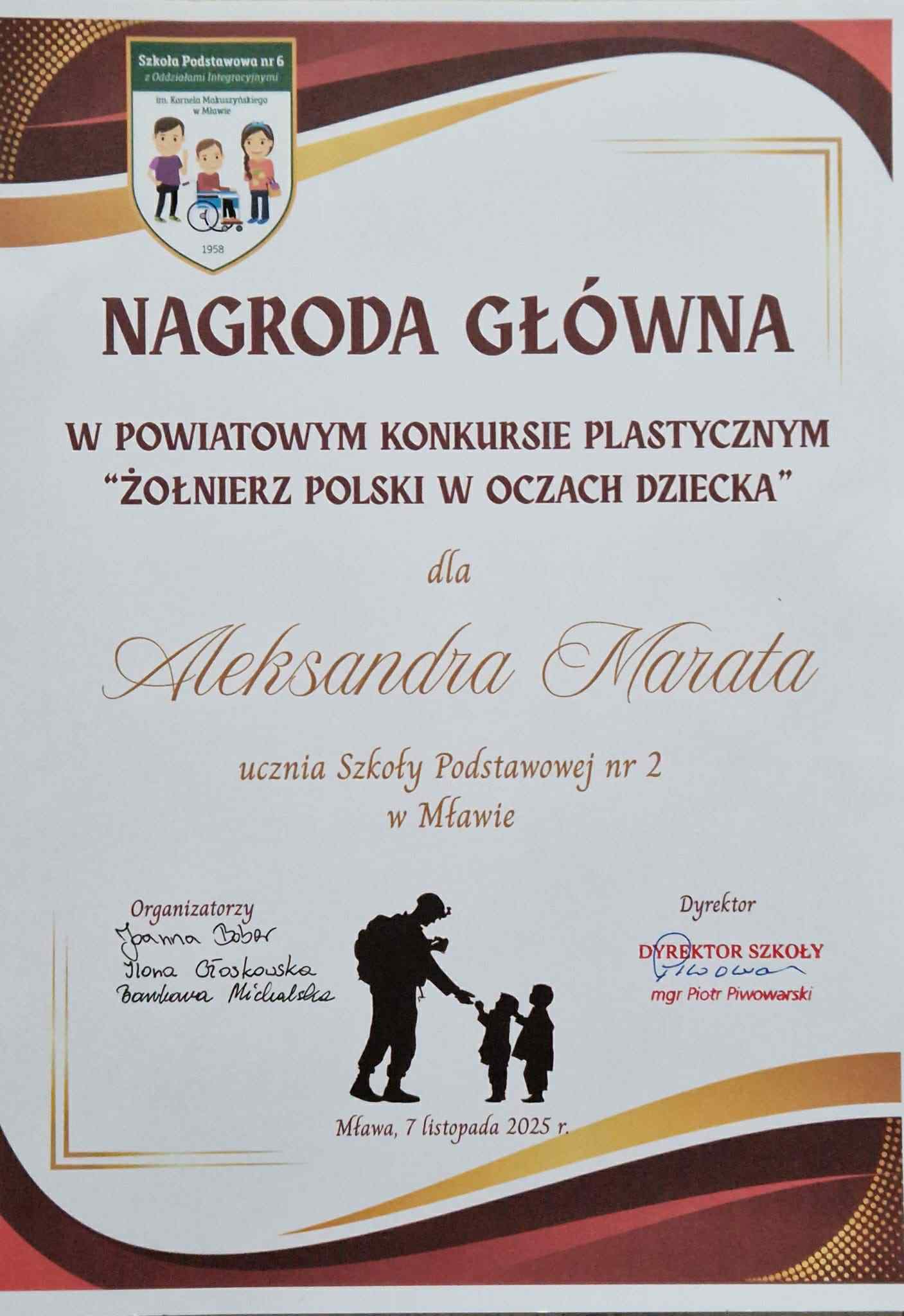 7 listopada rozstrzygnięto Powiatowy konkurs „Żołnierz polski w oczach dziecka”, którego celem jest kształtowanie postaw patriotycznych oraz szacunku wobec osób walczących o niepodległość i stojących na straży naszej wolności. Miło nam poinformować, że wśród nagrodzonych znalazł się Aleksander Marat. Serdecznie gratulujemy Aleksandrowi oraz dziękujemy wszystkim uczestnikom za zaangażowanie.