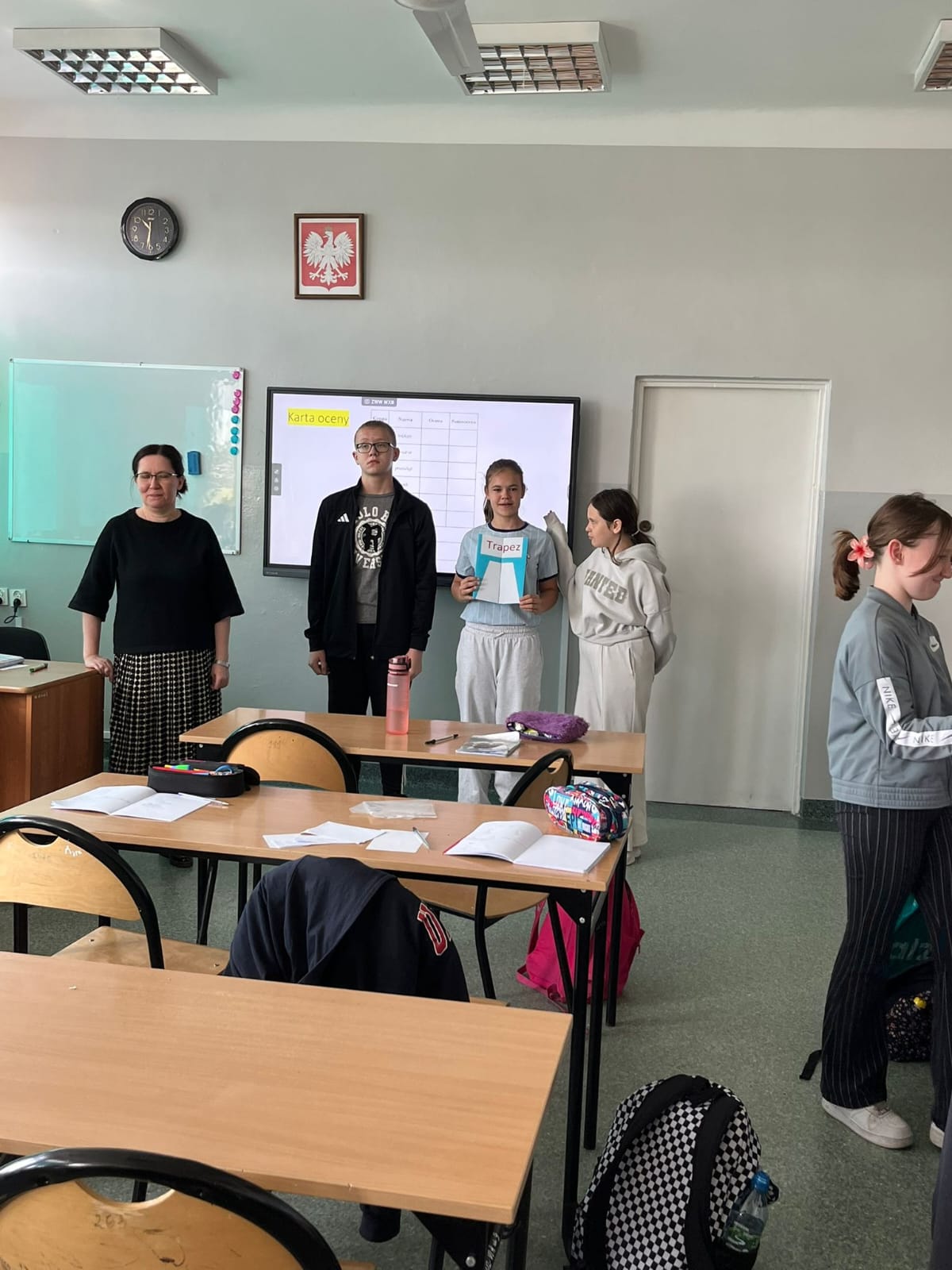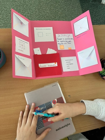 Uczniowie klasy 5a wzięli udział w szkolnym projekcie z matematyki pt. „Przedstaw się …”, który polegał na pracy w grupie i wykonaniu lapbooka na temat jednego wielokąta – trójkąta, kwadratu, prostokąta, równoległoboku, rombu albo trapezu. Pomysł i projekt pracy zostały najpierw omówione z nauczycielem, a następnie wykonane na lekcji matematyki.