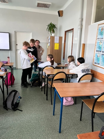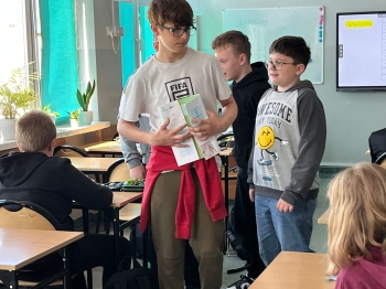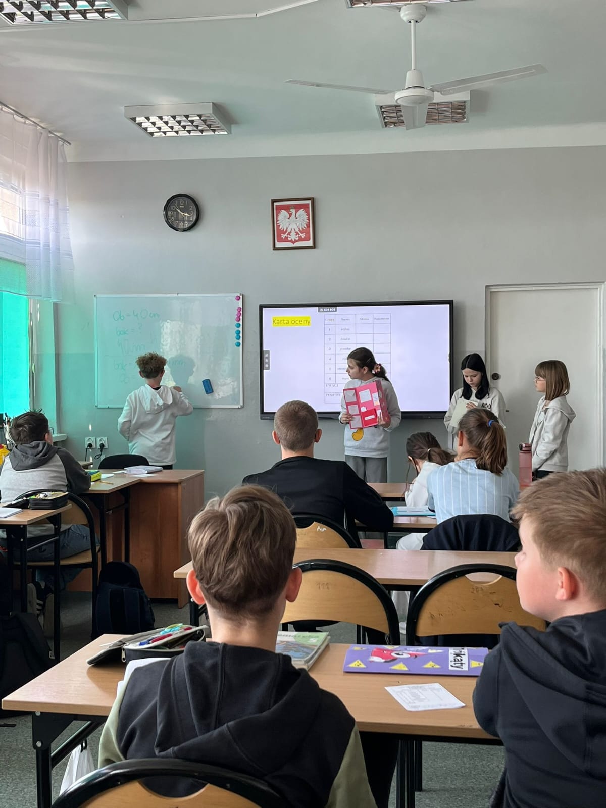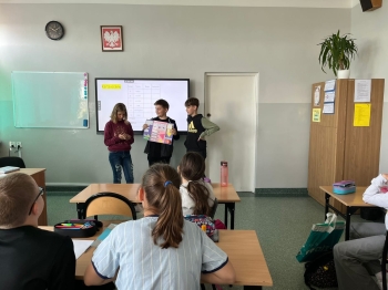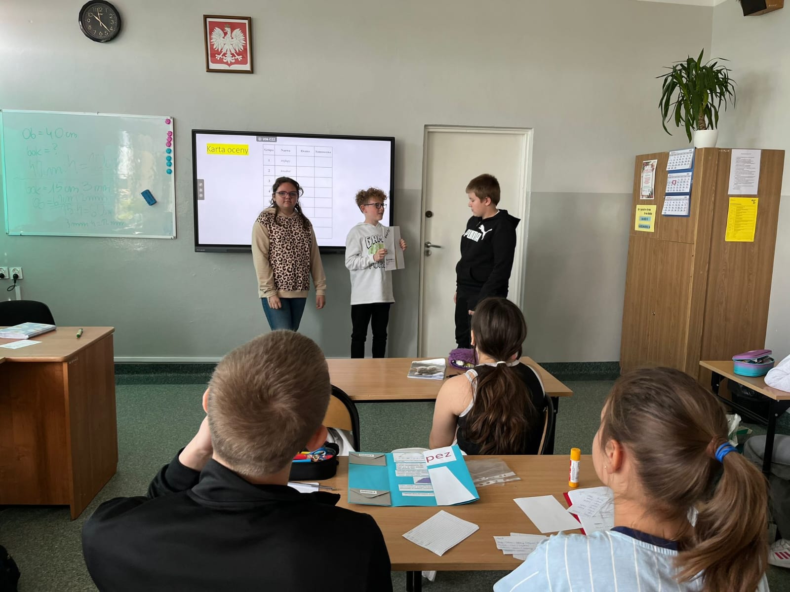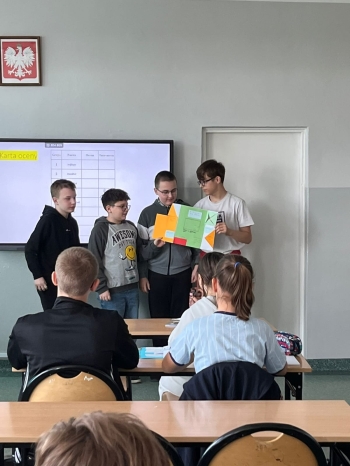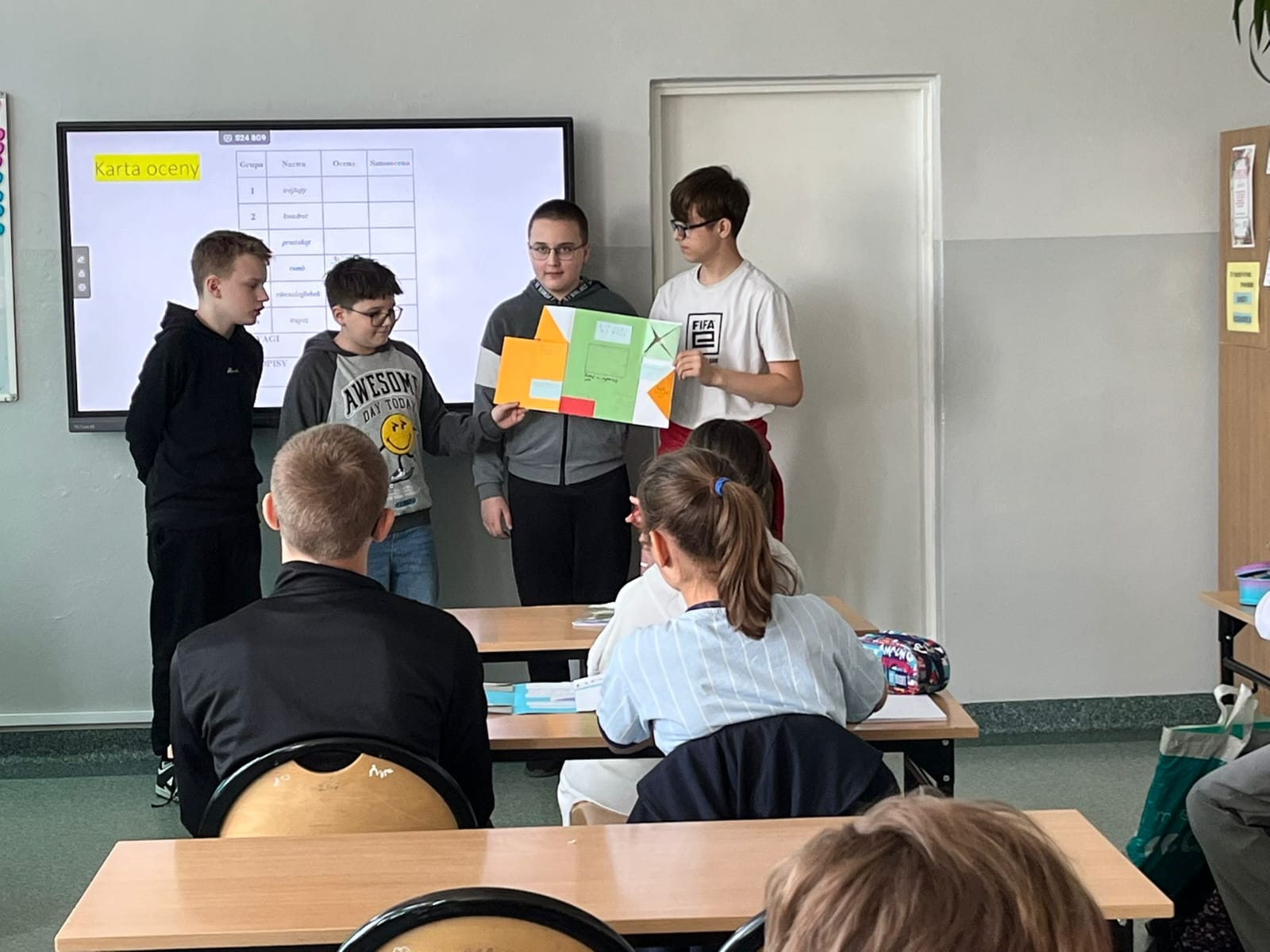 Ważnym zadaniem każdej grupy była prezentacja swojego lapbooka. Uczniowie przygotowali „garść” ciekawostek dla kolegów, wykazali się pomysłowością i kreatywnością. Chętnie tłumaczyli oraz przedstawili bohaterów swoich prac, przypomnieli definicje wielokątów, a nawet nazwy i ich własności w językach obcych. Nie zapomnieli o zadaniach obliczeniowych (np. obliczanie obwodów, miar kątów) oraz o rysunkach.