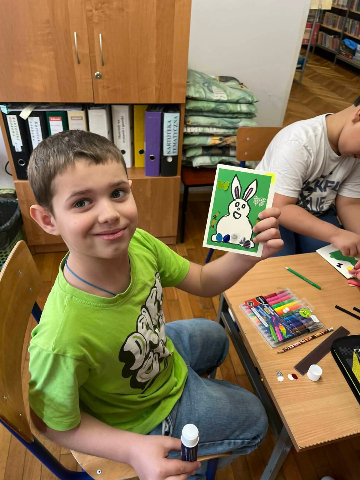 18 marca 2026 r. Bogumiła Pawłowska, na zaproszenie Katarzyny Chmielewskiej-Jeziorskiej, bibliotekarza Szkoły Podstawowej nr 2 w Mławie, przeprowadziła wielkanocne zajęcia edukacyjne. Uczniowie klas pierwszych wysłuchali bajki o Wielkanocnym zajączku, wykonywali zadania i kartki świąteczne. Otrzymali tajemniczy list od zajączka, który zgubił wszystkie pisanki i prosił dzieci o pomoc w ich znalezieniu. Dzięki rozwiązaniu zagadek o wiośnie i prawidłowemu wykonaniu zadań gimnastycznych udało się odszukać jajka i uratować święta.