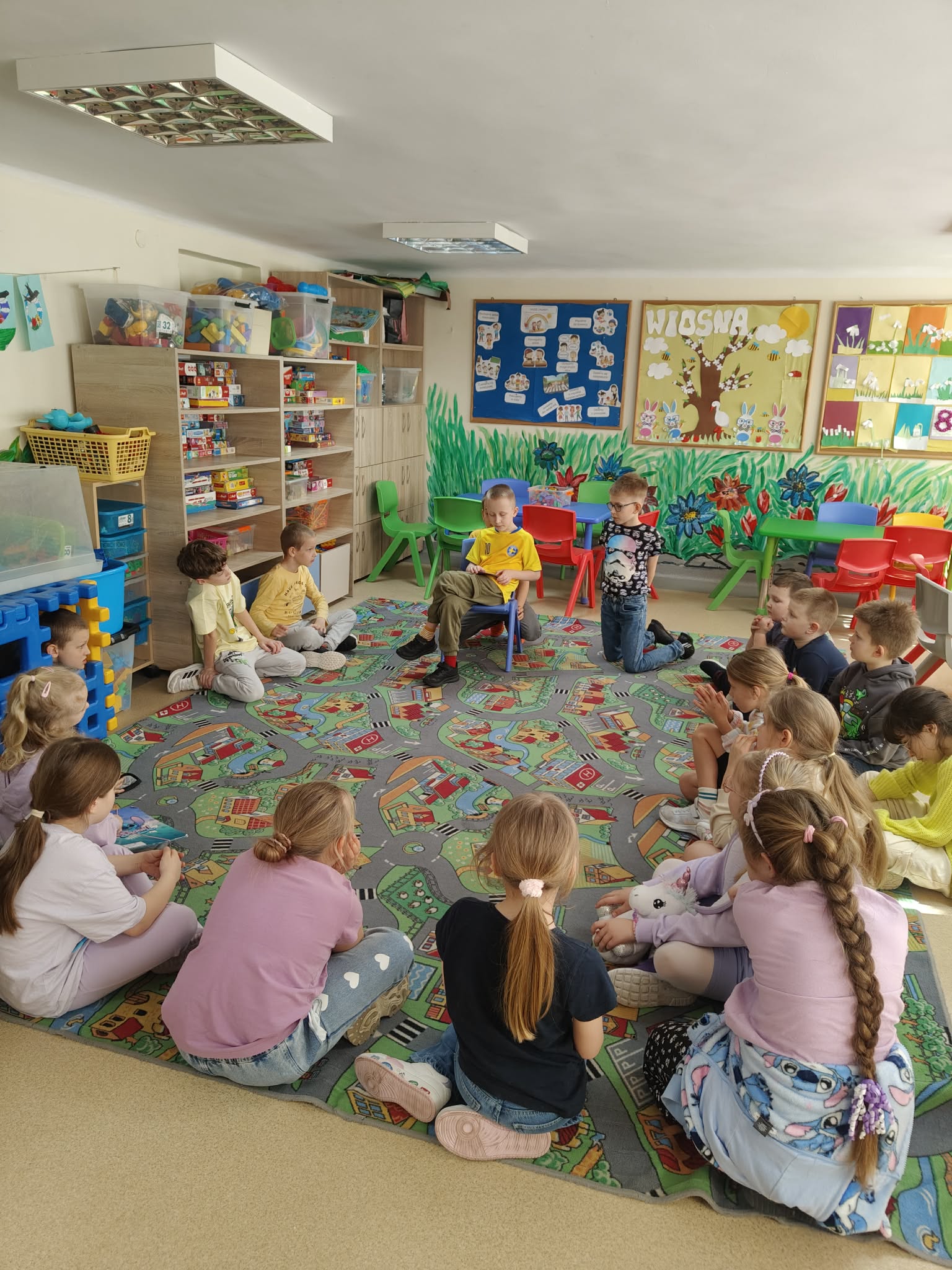 Dzieci zapoznały się ze zmianami zachodzącymi w przyrodzie wraz z nadejściem wiosny. Omawiano oznaki wiosny oraz wiosenne zwyczaje. Czytano wiersz „Ptasie radio”, a następnie dzieci naśladowały głosy ptaków wymienionych w utworze oraz rozpoznawały je na ekranie multimedialnym. Wykonywano prace plastyczne związane z tematyką wiosny, w tym oznaki wiosny oraz wiosenne kwiaty.